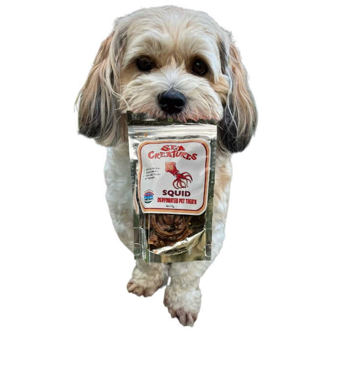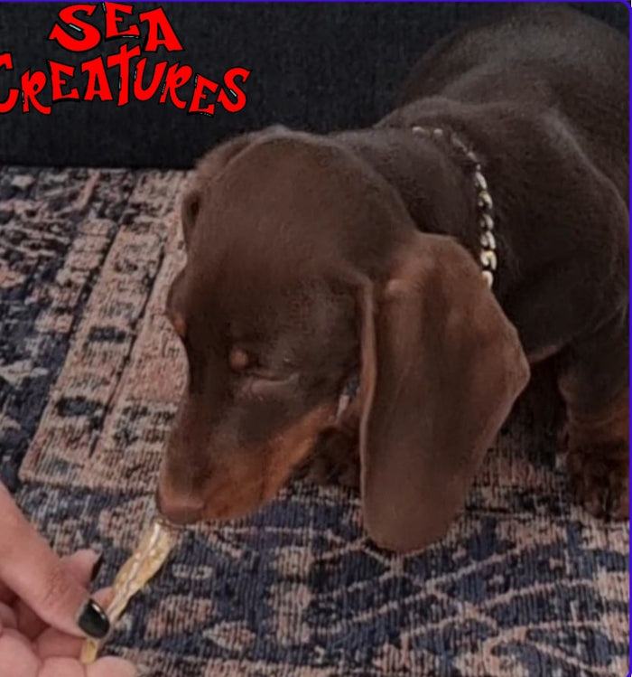 "Oh boy, seafood crunchies! My tail does the helicopter spin every time. Salty, chewy, perfect for a sophisticated canine palate. More squid bites, please!"